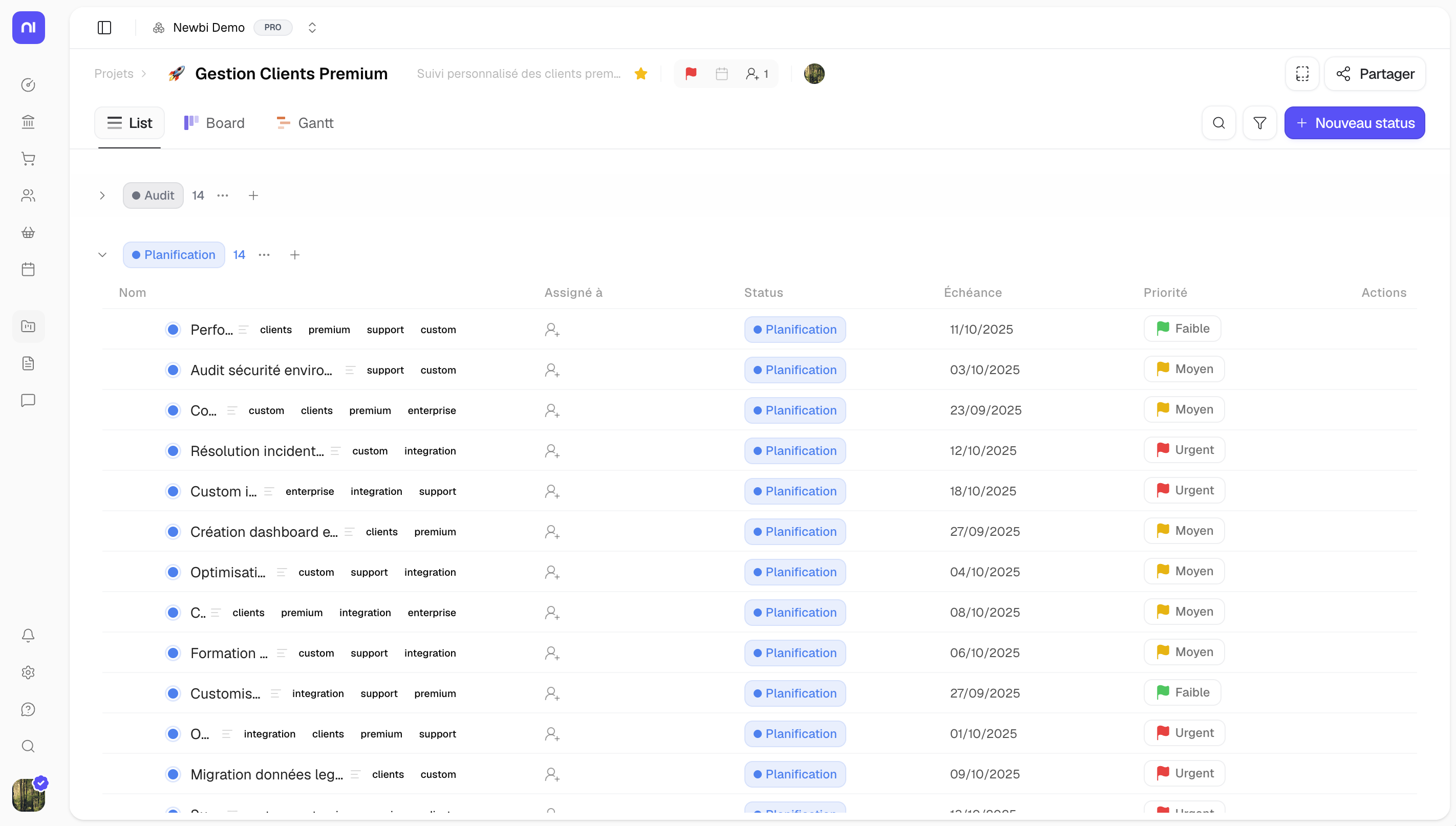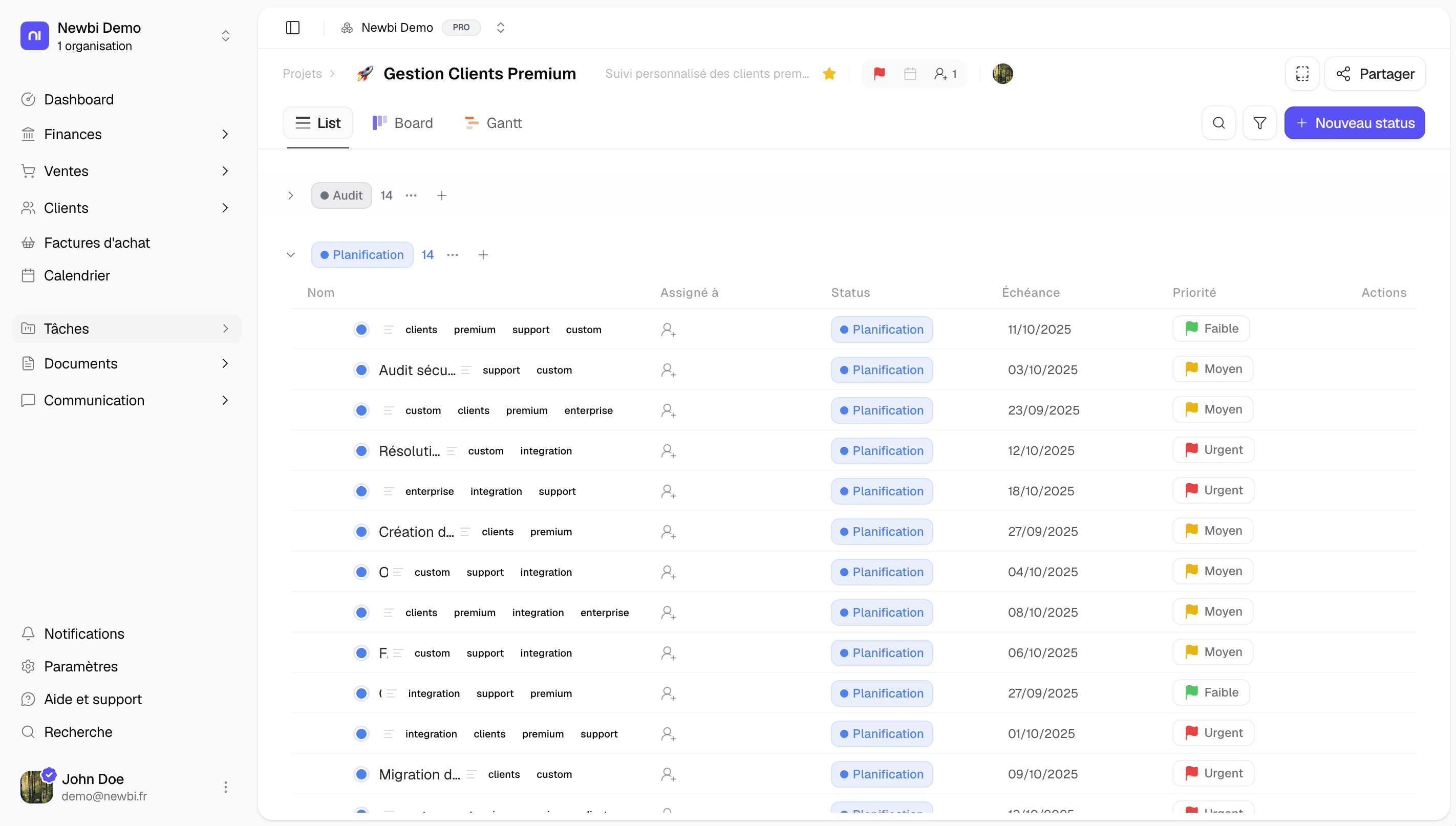 Affichez toutes vos tâches en tableau avec statut, priorité, assigné et échéance.